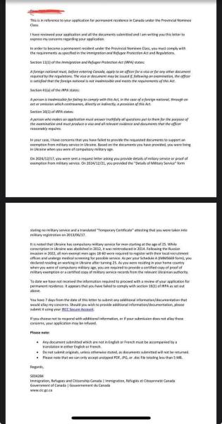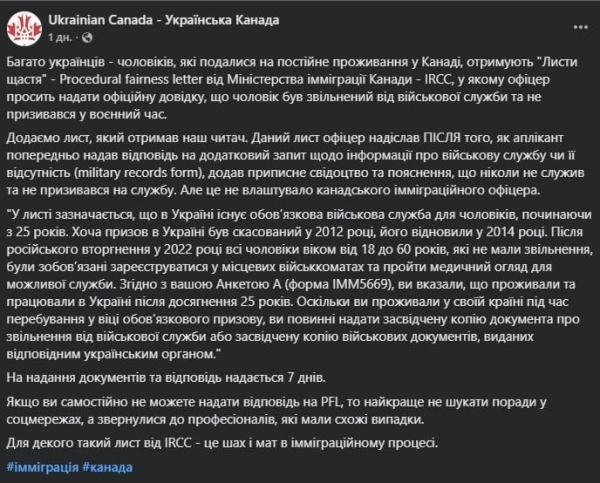 Отмечается, что «письма о процедурной справедливости» (Procedural fairness letter) украинским мужчинам в Канаде рассылает Министерство по делам иммиграции. В письме чиновники просят предоставить официальную справку о том, что заявитель был освобожден от военной службы в Украине и не призывался в военное время.