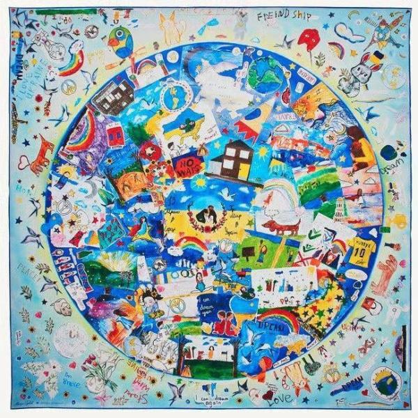 Красочный шарф разработали ученики лондонской украинской школы Святой Марии совместно с художницей Марией Дыкало. На ткани изображены детские мечты о будущем — воссоединение с семьями, домами и любимыми животными. Платок изготовила лондонская компания Aspinal.