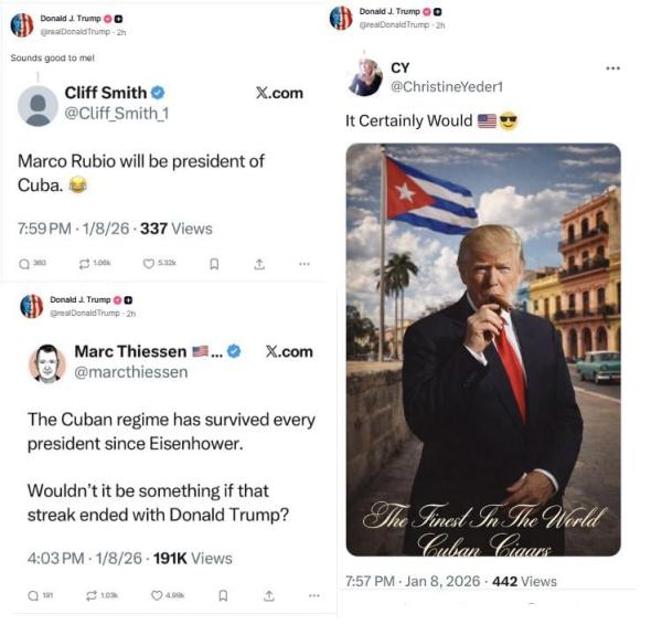 Перед этим президент США сделал несколько репостов чужих публикаций, прозрачно намекая на близкое падение коммунистической диктатуры на Кубе. В одном из репостнутых комментариев предлагается сделать президентом Кубы действующего госсекретаря США Марко Рубио, который имеет кубинские корни.