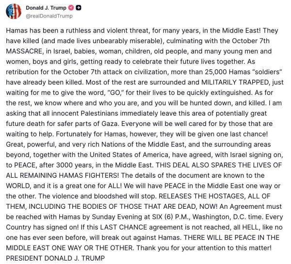 «Соглашение с ХАМАС должно быть достигнуто до воскресенья вечером в шесть (6) часов по Вашингтону. Все страны подписали соглашение! Если это соглашение, которое является последним шансом, не будет заключено, ХАМАС накроет невиданный доселе ад», — предупредил глава Белого дома.