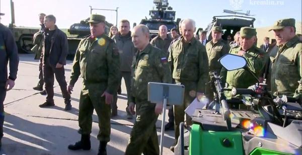 Как сообщают российские СМИ, Путин в военной форме осмотрел образцы вооружения, специальной и военной техники на полигоне «Мулино» в Нижегородской области, где состоялся основной этап учений.