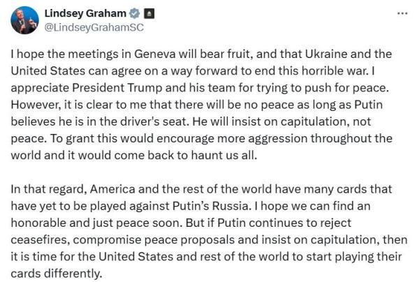«В этом отношении у Америки и остального мира есть много козырей, которые еще предстоит разыграть против путинской России. Я надеюсь, что мы сможем вскоре найти достойный и справедливый мир.», — заявил Грэм.