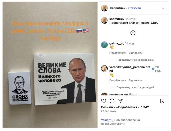 Специальный представитель российского диктатора Кирилл Дмитриев привез на переговоры в США конфеты с цитатами Владимира Путина на их обертках. Об этом он сам сообщил на своей странице в Instagram.