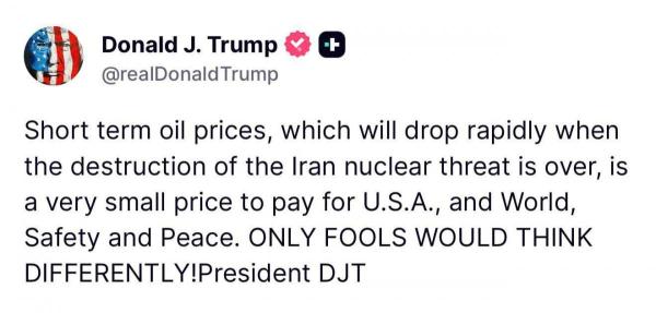 «Краткосрочные цены на нефть, которые быстро упадут, когда будет уничтожена иранская ядерная угроза, – это очень небольшая цена за безопасность и мир для США и всего мира», – отметил Трамп.
