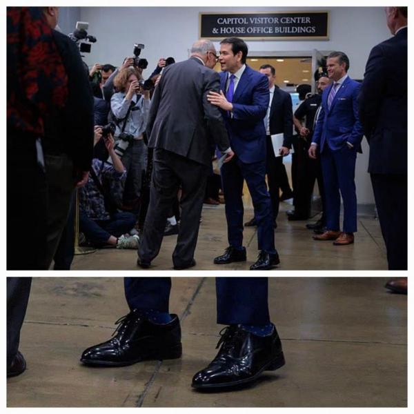 В то же время пара, подаренная Рубио, оказалась велика: на одном из фото видно, что ботинки выглядят значительно больше его стопы.