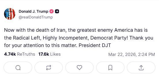 «Теперь, после краха Ирана, самым большим врагом Америки является радикально левая, крайне некомпетентная Демократическая партия!» – написал он в соцсети Truth Social.