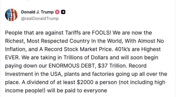 В сообщении американский лидер похвалил экономику страны и отметил, что тарифы принесут «триллионы долларов». По словам Трампа, их вскоре можно будет использовать для начала погашения огромного долга страны.