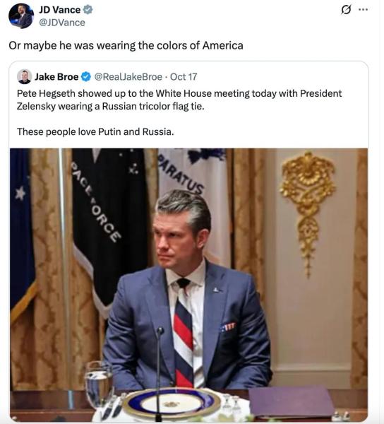 Пользователи соцсетей обвинили Хегсета в ношении галстука с цветами российского флага, но за министра внезапно вступился вице-президент Джей Ди Вэнс.