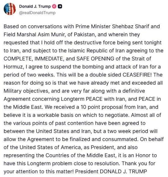 «Я согласен приостановить бомбардировки и нападения на Иран на две недели. Это будет двустороннее ПРИОСТАНОВЛЕНИЕ ОГНЯ! Причина этого в том, что мы уже достигли и превысили все военные цели, и очень продвинулись вперед в достижении окончательного Соглашения о долгосрочном МИРЕ с Ираном и МИРЕ на Ближнем Востоке», – заявил Трамп.